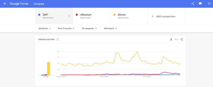 Pendant ce temps, Google Trends montre que les recherches sur «DeFi» ont augmenté au cours de l’année. Cependant, ils restent beaucoup plus bas que «Bitcoin» ou «Ethereum». Cela suggère que la majeure partie de l’intérêt pour ce secteur encore jeune provient de l’industrie de la cryptomonnaie elle-même.