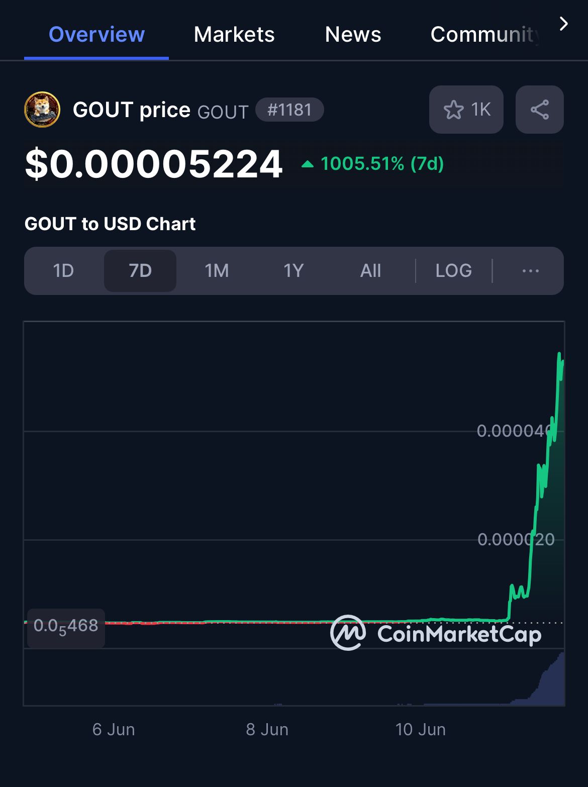 SponsoredMais le grand gagnant de ce rebond général est l’altcoin GOUT. Ce token semble s’être trop bien acclimaté à la hausse actuelle du marché. En une journée, il a signé une performance ahurissante de 1 005 %, soit une multiplication par 11 de sa valeur en 24 heures. Cette croissance s’appuie sur un volume de trading explosif. Selon CoinMarketCap, le volume sur GOUT a bondi de 2 238 % sur la même période.