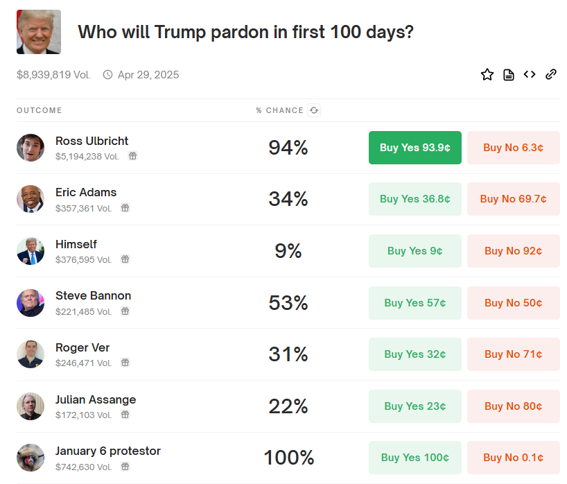 Il n’en a pas fallu davantage pour réjouir les utilisateurs de la plateforme de pari Polymarket, qui prédisent désormais que le pardon de Ross Ulbricht pourrait avoir lieu sous 100 jours avec 95 % de chances. On note toutefois que Donald Trump avait promis de le faire dès son premier jour à la Maison Blanche et ne l’a pas fait, c’est pourquoi une partie de la communauté reste sceptique.