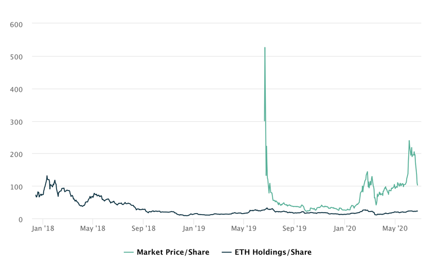 À ce moment-là, le cours de l’action de la fiducie reflétait une prime de 700% sur l’actif ETH sous-jacent. La baisse de cette semaine témoigne d’un retour au prix d’origine avant juin.