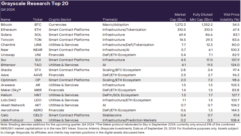 « Le Top 20 représente un ensemble diversifié d’actifs issus de tous les secteurs de la crypto qui, selon nous, affichent un fort potentiel pour le trimestre à venir (Exhibit 4). Notre approche intègre une gamme de facteurs, incluant la croissance du réseau/l’adoption, les catalyseurs à venir, la durabilité des fondamentaux, l’évaluation des tokens, l’inflation de l’offre de tokens et les risques potentiels, » a déclaré Grayscale.