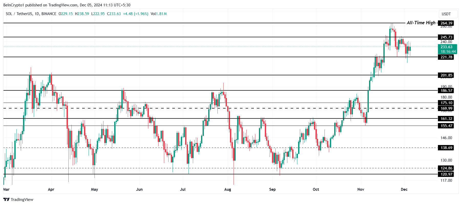 Le cours de Solana (SOL) a récemment enregistré une action notable, jusqu’à atteindre un nouveau sommet historique (ATH) de 264 $ avant de subir un recul. Actuellement échangé autour de 233 $, l’altcoin a finalement trouvé une certaine stabilité au-dessus du niveau de support de 221 $.