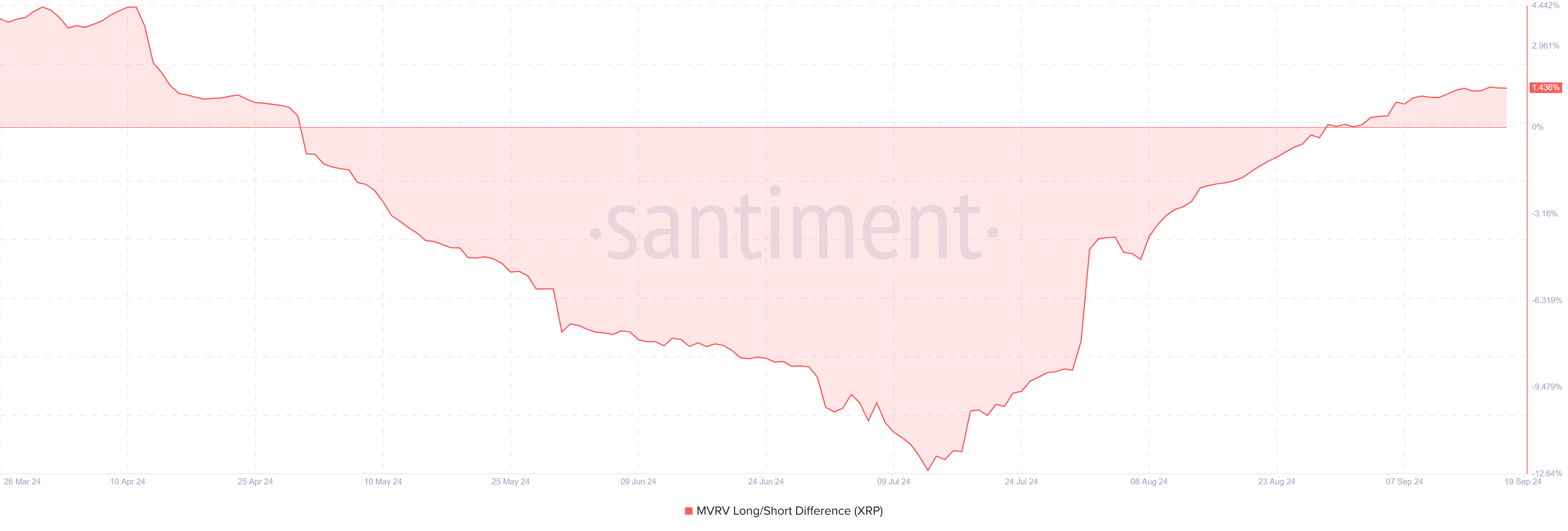 En analysant le momentum macro du XRP, la différence de l’indicateur Long/Court de MVRV (Valeur de Marché à Valeur Réalisée) révèle un changement intéressant. En effet, cet indicateur aide à évaluer les conditions de prise de profit des investisseurs.