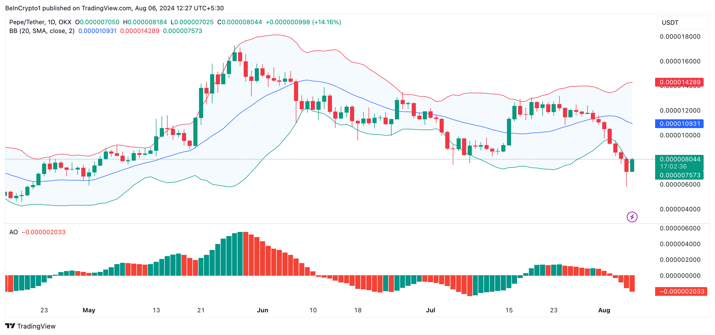Un examen plus poussé de cet indicateur révèle également que PEPE se négocie actuellement sous la bande inférieure, ce qui pourrait indiquer une poursuite de sa tendance baissière.