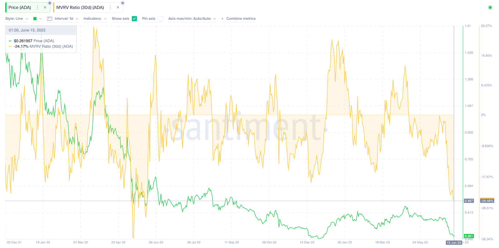 En termes simples, le ratio MVRV permet d’évaluer la situation financière nette des investisseurs en comparant le prix auquel ils ont acheté ADA à sa capitalisation boursière actuelle.