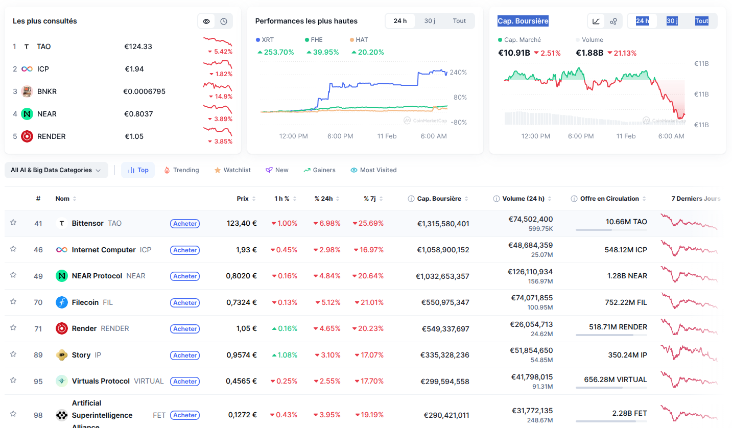 Côté crypto IA, l’euphorie retombe. Les tokens affichent une baisse d’environ 5 % sur 24 heures, et leur capitalisation globale recule de 2,5 %. Ce, pour deux raisons : le marché crypto est généralement baissier, et la plupart des projets peinent à démontrer leur utilité réelle. Justin Sun, fondateur de Tron, estime que le secteur manque d’un « moment ChatGPT » capable de prouver la valeur concrète des IA décentralisées.