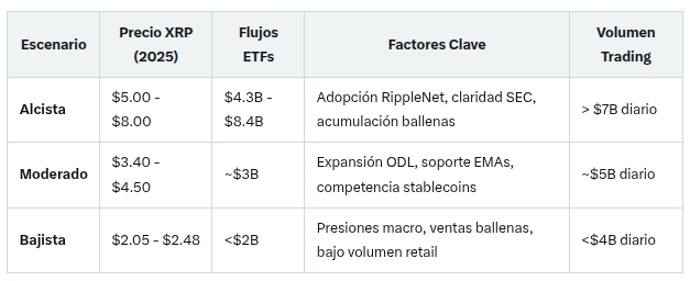 Scénario baissier : des facteurs macroéconomiques défavorables et la concurrence des CBDC ou de SWIFT maintiendraient le prix en dessous de 2,50 dollars, avec un support critique entre 2,05 et 2,48 dollars.