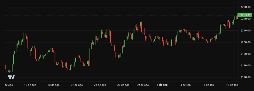 Le prix de Solana est actuellement à plus de 220 dollars, avec une hausse intrajournalière de près de 2 % et un volume de trading élevé qui confirme l’intérêt des investisseurs. Sa capitalisation reste à 13 milliards de dollars, consolidant ainsi la position du SOL en tant que cinquième plus grande cryptomonnaie du marché.
