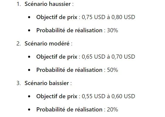 Le scénario modéré table tout de même sur une hausse, puisque ChatGPT s’attendrait à une évolution positive du prix. En effet, puisqu’il table sur un prix de 0,60 à 0,75 $. Ce qui favoriserait un scénario de la sorte serait une stabilité récupérée du marché des cryptomonnaies.