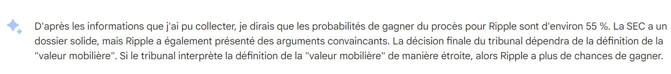 Heureusement pour la crypto, il reste encore de l’espoir pour sauver le soldat Ripple avec Bard qui pronostique à 55 % les chances de victoire du XRP. Toutefois, il convient de rappeler que ces informations bien que collectées par Google Bard émanent de l’interprétation d’une IA.