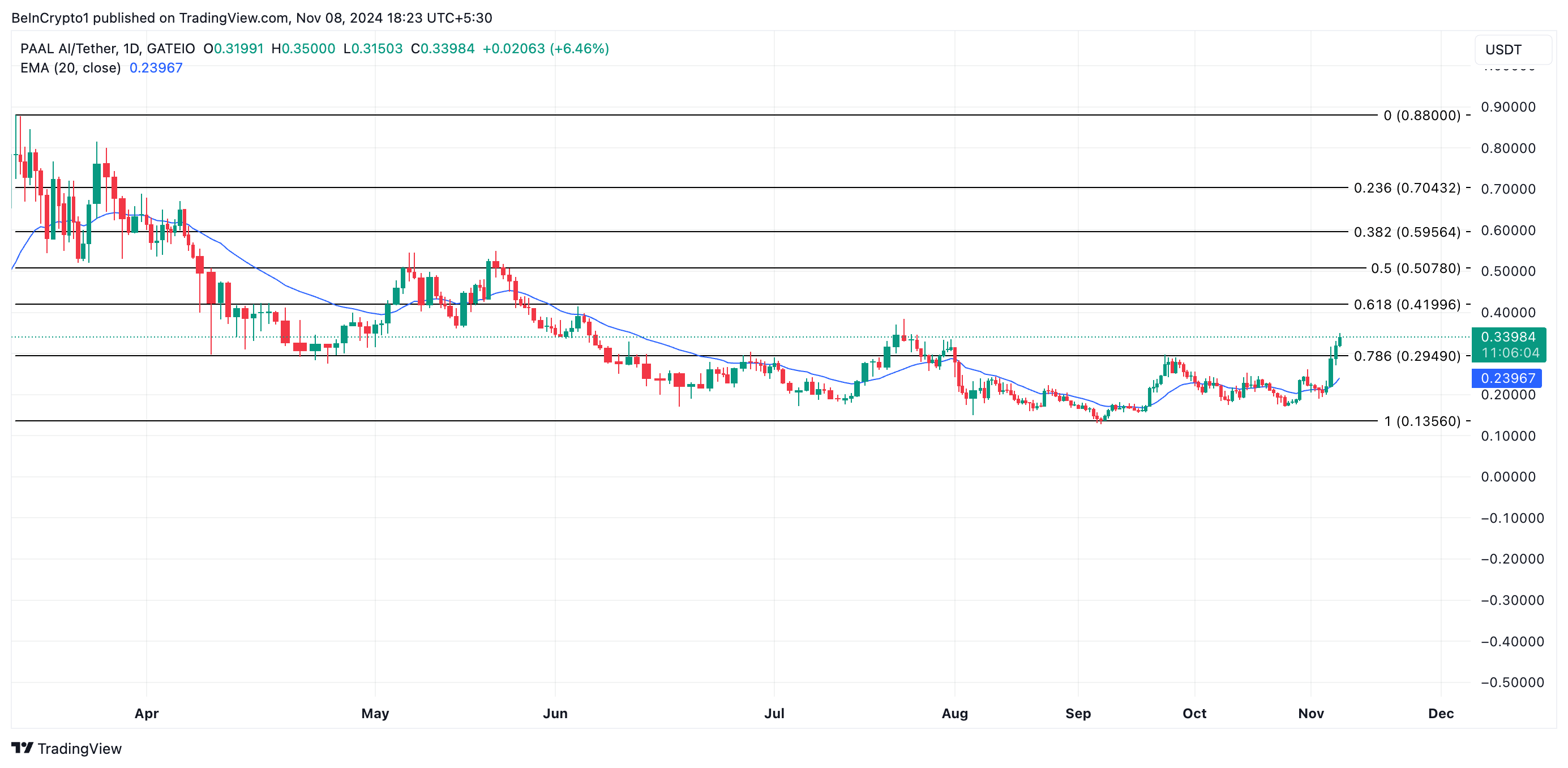 Si PAAL maintient sa tendance haussière, son cours pourrait grimper vers les 0,41 $, niveau atteint pour la dernière fois en mai. À l’inverse, une augmentation de la pression vendeuse invaliderait cette perspective haussière et pourrait faire chuter le cours du token vers les 0,13 $.