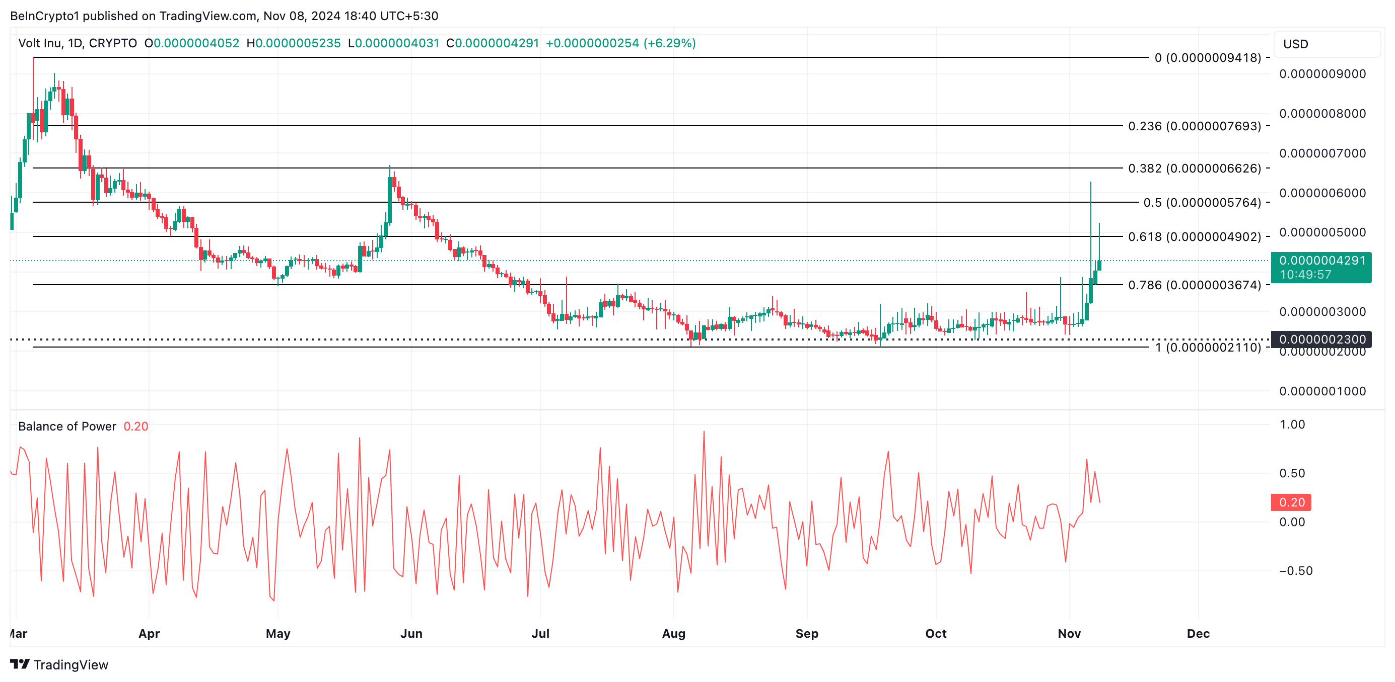 À l’heure actuelle, le Balance of Power (BoP) de VOLT, qui mesure la force des acheteurs par rapport aux vendeurs sur le marché, confirme que la pression d’achat reste significative. Son BoP est positif à 0,20, suggére que les acheteurs ont le contrôle et sont en train de pousser le cours à la hausse.