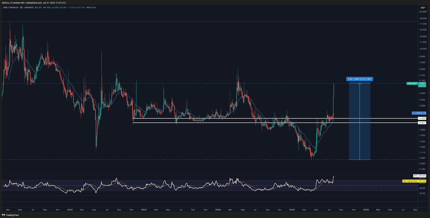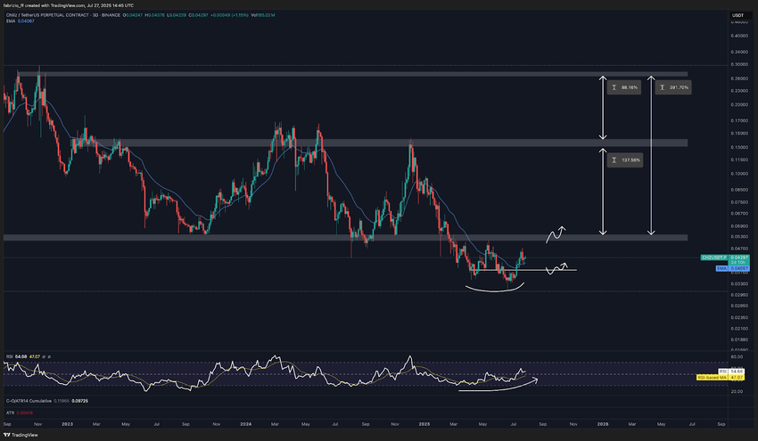 Nous voyons déjà quelques signaux précurseurs. Au moment de la rédaction, $CHZ a récupéré des niveaux clés sur le graphique en 3 jours pour la première fois depuis début 2025. Il a franchi à nouveau sa moyenne mobile exponentielle sur 10 périodes et a récupéré le niveau 50 du RSI, deux signes d’une amélioration de la dynamique. D’un point de vue technique, cette zone marque une zone d’accumulation intéressante avec une invalidation claire si les récents creux sont franchis. Si le rallye se poursuit, le prochain objectif serait de récupérer la résistance à 0,05 $. Au-delà, il y a une fourchette jusqu’à 0,13 $ (environ 140 % de potentiel à la hausse), et au-delà, une autre étape jusqu’à 0,26 $, offrant près de 400 % de potentiel à la hausse dans le meilleur des cas, synchronisé avec l’événement de 2026.