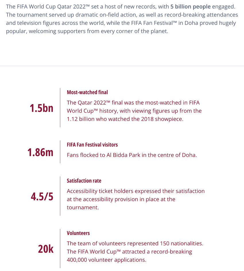 Selon la FIFA, plus de 5 milliards de personnes ont suivi le tournoi sur différentes plateformes, et la finale à elle seule a atteint 1,5 milliard de téléspectateurs, établissant un nouveau record et dépassant le précédent sommet de 1,12 milliard de vues de la finale de 2018.