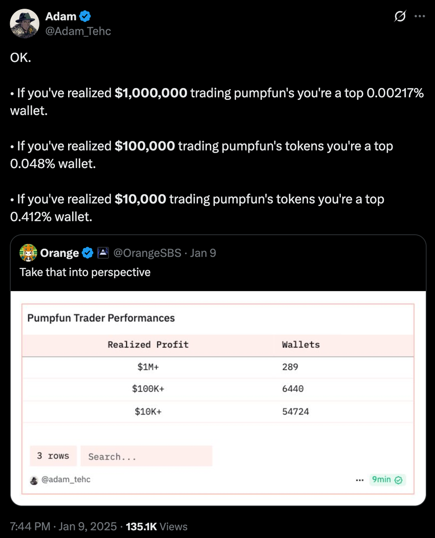 Les données au niveau des wallets dressent un tableau encore plus sombre. D’après les données de janvier 2025, sur plus de 13,4 millions de wallets sur la plateforme, seulement 55 000 ont réalisé au moins 10 000 dollars de profit, soit à peine 0,4 %. Et la classe insaisissable des millionnaires en crypto ? Seuls 294 wallets ont gagné plus de 1 million de dollars, représentant 0,002 % des utilisateurs.