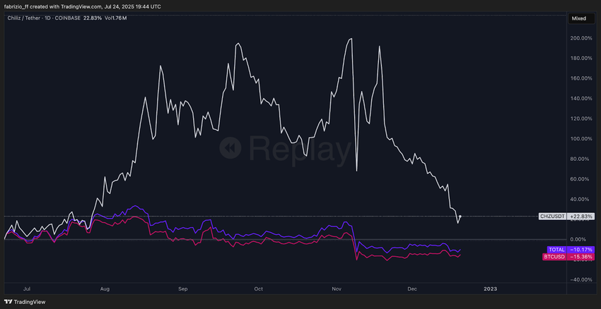 Il ne s’agissait pas d’un rallye alimenté par des conditions macroéconomiques favorables mais qui s’est produit lors de la dernière phase de l’un des marchés baissiers les plus sévères de la crypto à ce jour. Bitcoin était en baisse de plus de 70 % par rapport à son sommet historique, et la plupart des altcoins étaient en difficulté. Pourtant, dans cet environnement de marché brutal, $CHZ s’est décorrélé de $BTC et de l’indice crypto global ($TOTAL), surperformant les deux alors que l’attention se tournait vers les actifs liés au sport.
