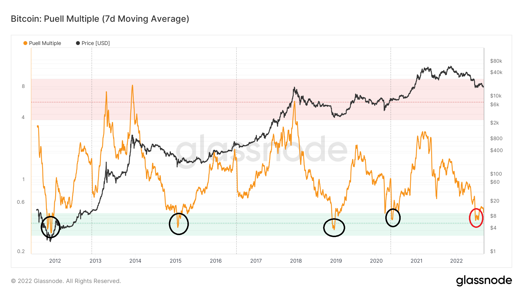 Le multiple de Puell est un indicateur qui mesure la santé des mineurs Bitcoin Il est créé en divisant la valeur d’émission quotidienne de BTC (en USD) par la moyenne mobile sur 365 jours de la valeur d’émission quotidienne. Ains, il permet de visualiser le cycle du marché du point de vue de la rentabilité des mineurs crypto.