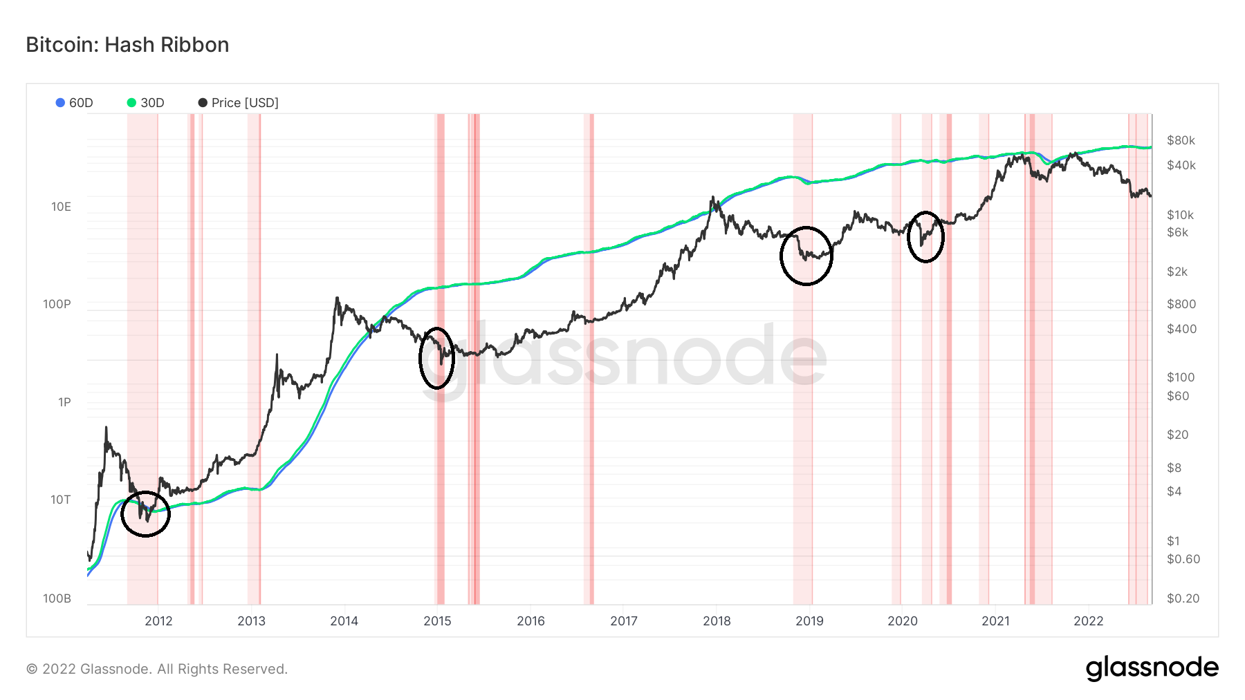 Les rubans de hachage sont des indicateurs basés sur le taux de hachage du BTC. Ils partent du principe que Bitcoin atteint un bottom lorsque les mineurs capitulent. La capitulation des mineurs signifie que leurs coûts de minage sont plus élevés que les récompenses qu’ils reçoivent en retour.