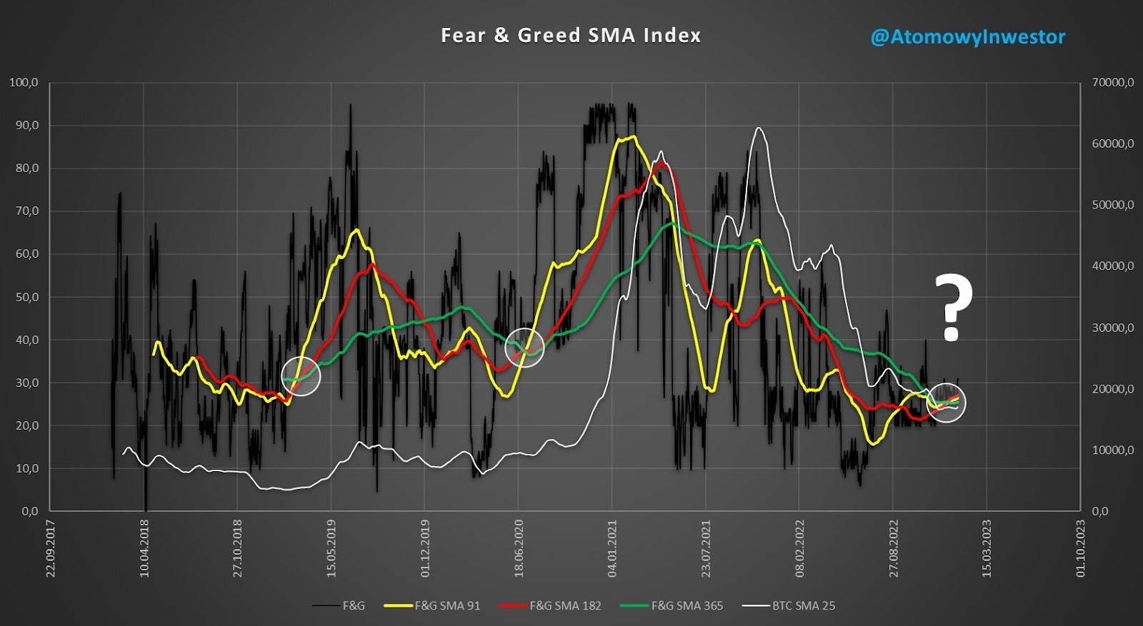 L’investisseur crypto et analyste de marché @AtomowyInvestor a partagé sur Twitter une nouvelle version de son graphique des moyennes mobiles (SMA) de l’indice Fear and Greed. Ce dernier prend en compte 3 courbes : trimestrielle (SMA 91D, en jaune), semestrielle (SMA 182D, en rouge) et annuelle (SMA 365D, en vert).