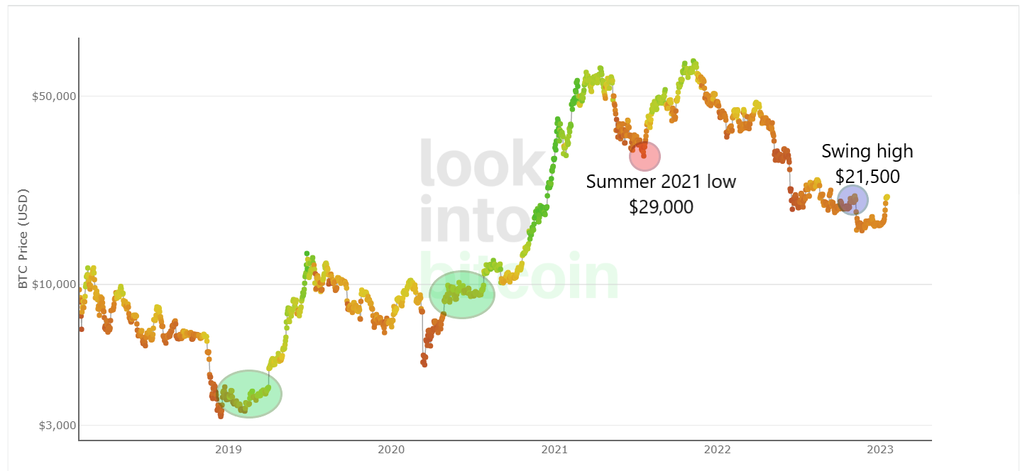Troisièmement, dans les deux cas précédents de creux extrêmes du cours du BTC, en 2019 et 2020, le retour de l’indicateur dans la zone neutre a marqué la fin de la période d’accumulation. Le début d’une tendance haussière a alors suivi, environ 1 à 2 mois plus tard (zones vertes).