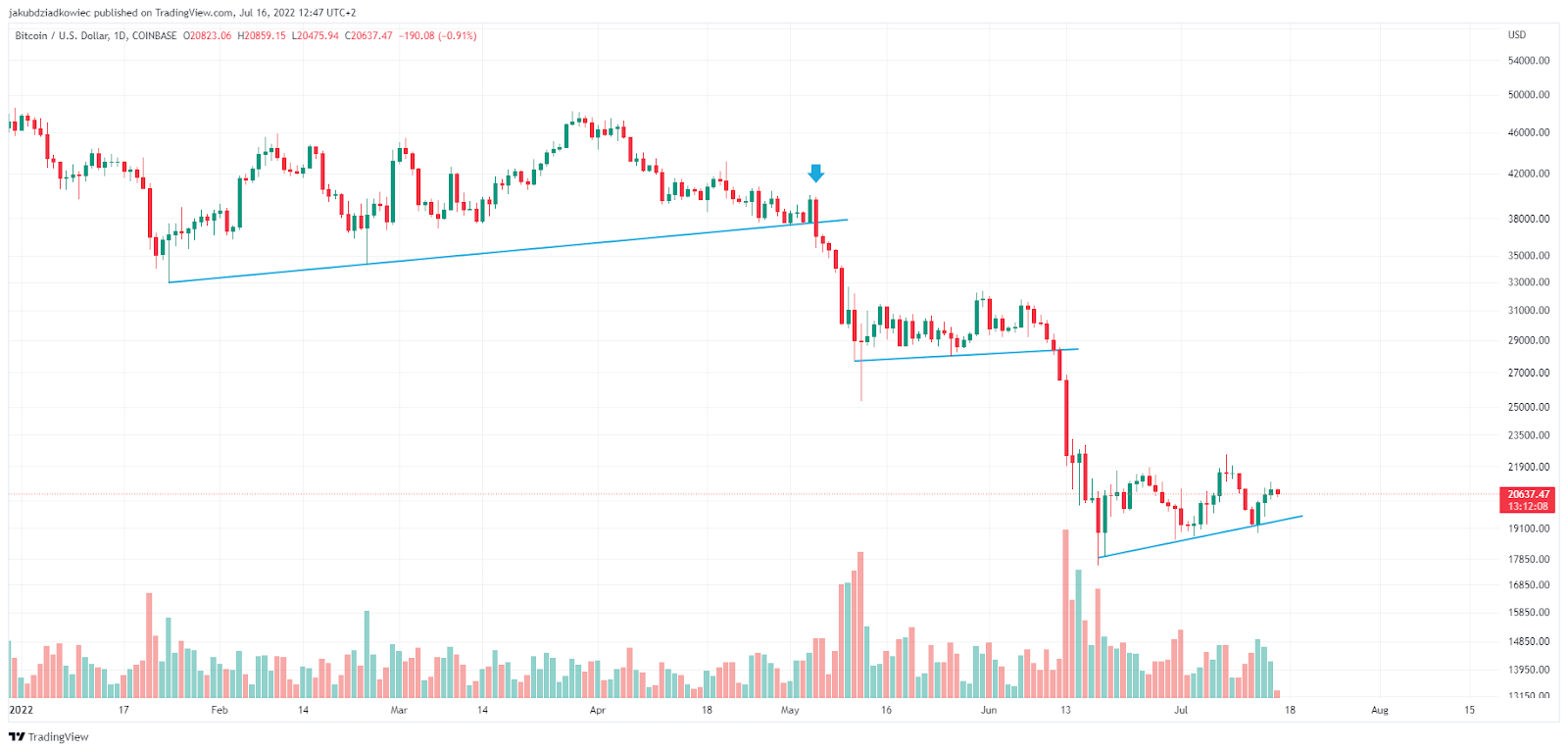 La chute vertigineuse du sentiment du marché crypto a eu lieu le 5 mai. À ce moment-là, Bitcoin a perdu le support au niveau des 38 000 $ et a chuté sous sa ligne de support ascendante (en bleu). Le 12 mai, il a enregistré un creux de 25 228 $ et a entamé une consolidation au-dessus de la ligne de support suivante.