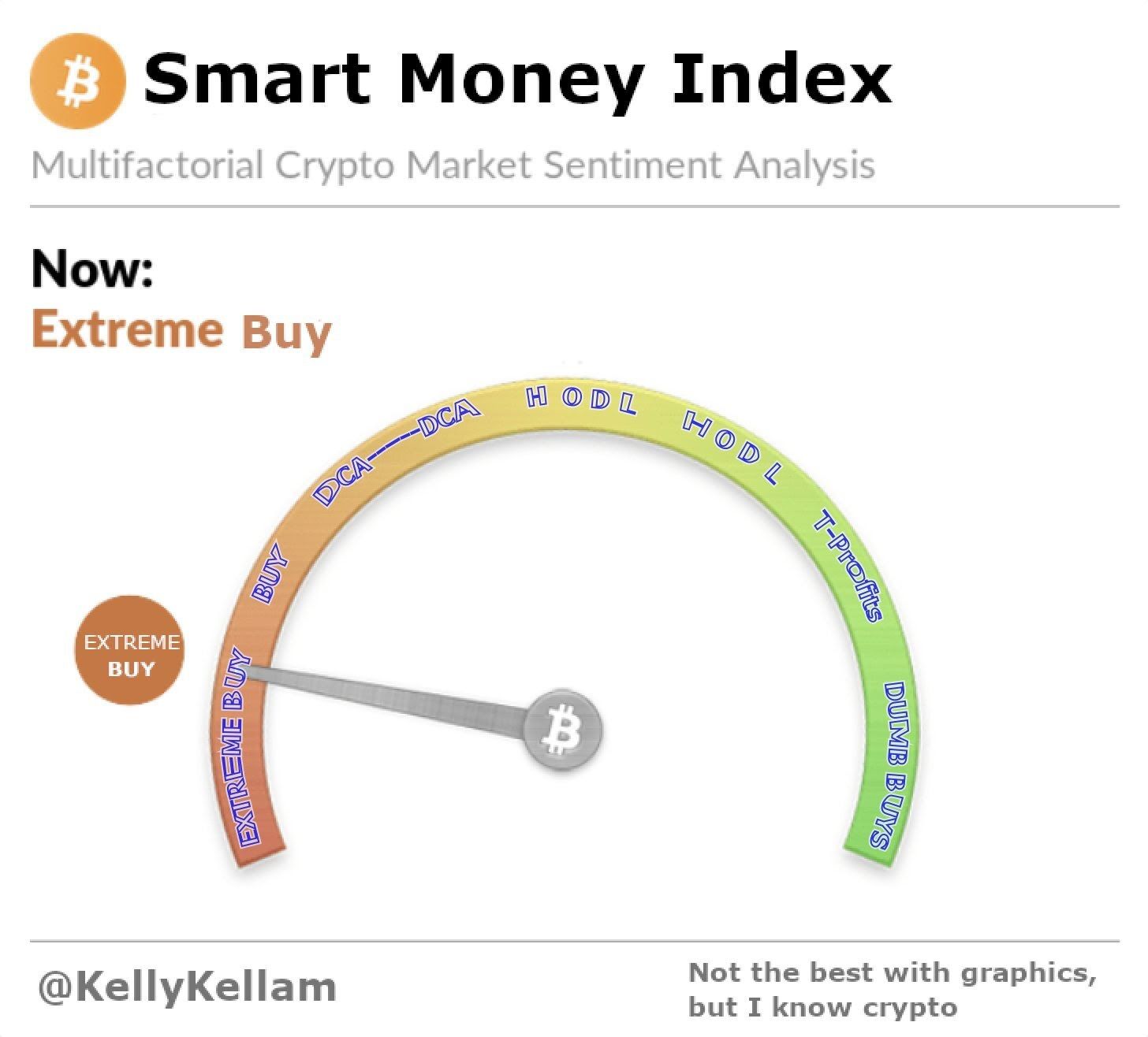 L’analyste et créateur de contenu crypto @Kellykellam a illustré cette relation en tweetant une version modifiée de l’indice de peur et d’avidité. Selon son interprétation, les lectures actuelles indiquent des niveaux “d’achat extrême”. Encore plus intéressant, l’analyste a même renommé l’indice “Smart Money Index” (littéralement Indice de l’argent intelligent) dans sa version.