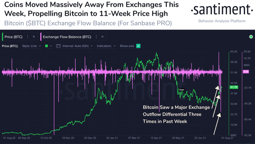 SponsoredSelon la société d’analyse on-chain Santiment, la flambée du prix de Bitcoin est en partie due aux sorties de fonds des exchanges cette semaine. Santiment a tweeté : ” Les mouvements du bitcoin sur les exchanges ont été l’un des principaux initiateurs de la hausse à laquelle nous avons assisté cette semaine. Le prix du BTC a atteint 42,5k $, et il y a eu d’énormes fluctuations de l’activité de trading favorisant les pièces sortant des exchanges lundi, mercredi et jeudi pour pousser les prix à la hausse.”