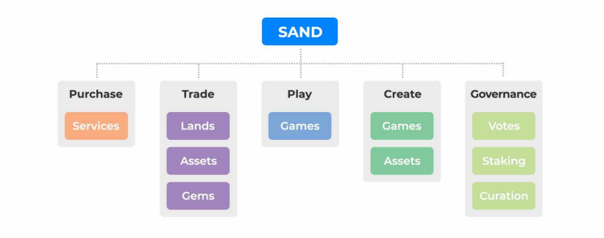 En mettant fortement l’accent sur l’idée crypto clé de la décentralisation, le jeu utilise le SAND pour implémenter ses cinq fonctionnalités: acheter, échanger, jouer, créer et gouverner. Les joueurs dépensent des SAND pour jouer à des mini-jeux, acheter de l’équipement, personnaliser des avatars ou acheter LAND – des composants du métaverse. Même les artistes peuvent dépenser des SAND pour télécharger leurs créations sur le marché et utiliser des gemmes consommables pour définir leur rareté et leur rareté.