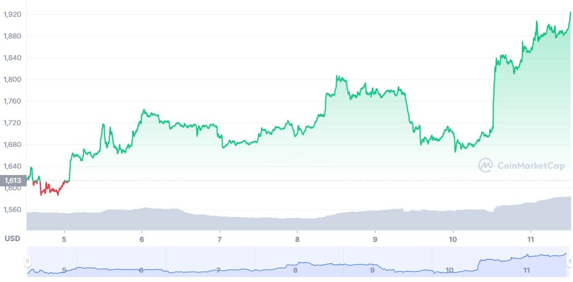 Selon Bloomberg, Ethereum (ETH) serait le premier à bénéficier du phénomène. La pièce de Vitalik Buterin a en effet vu son cours grimper de 12%. A l’heure de cette rédaction, l’ETH ne vaut pas moins de 1 925 dollars et continue son ascension, porté par l’arrivée prochaine de The Merge.