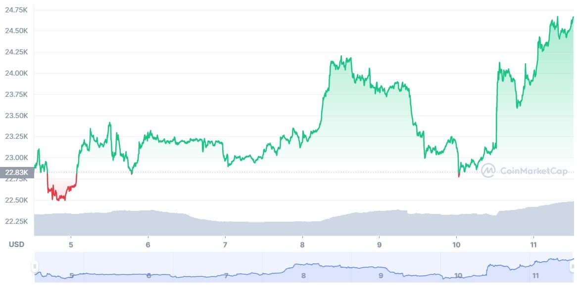 La surprise de l’inflation n’a également pas échappé à Bitcoin, qui se hisse désormais à 24 668 dollars. Tout comme sa concurrente, la petite pièce orange fait l’objet d’un double phénomène. Celui, bien sûr, de cette nouvelle inattendue mais également de la remontée des cours traditionnels. La bourse de New-York a terminé en hausse ainsi que la Nasdaq, à laquelle Bitcoin est corrélé.