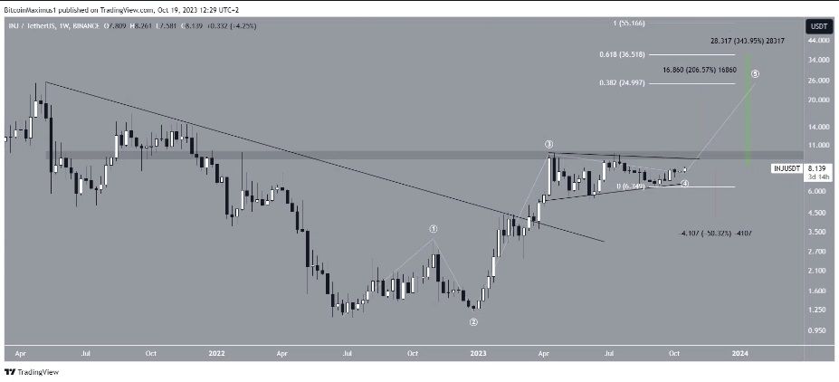 Malgré cette prévision haussière du prix INJ, une clôture hebdomadaire en-dessous de la ligne de support du triangle invalidera ce scénario.