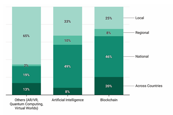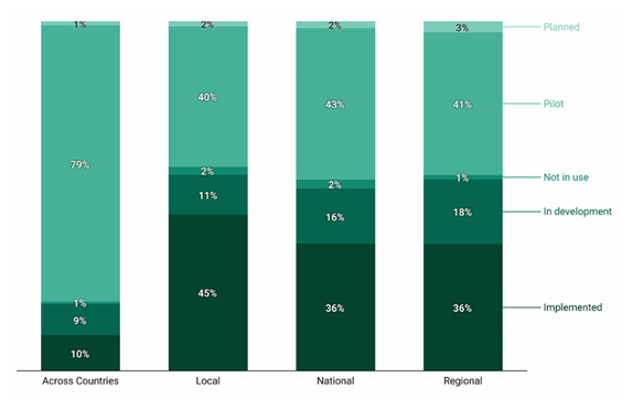 Sponsored SponsoredL’autre fait intéressant apporté par le graphique ci-dessous est que les administrations locales ont relativement plus de cas mis en œuvre que les administrations nationales. Malgré un nombre inférieur de cas en nombre absolu, il existe davantage de solutions pleinement opérationnelles basées sur l’IA, la blockchain ou d’autres technologies émergentes au sein des administrations locales. Même si les administrations locales et régionales peuvent avoir des capacités techniques, organisationnelles, juridiques ou financières relativement inférieures à celles des organisations nationales, elles semblent mettre en œuvre pleinement les nouvelles solutions à un rythme plus élevé. Mais d’un autre côté, l’administration nationale peut avoir plus de capacité à développer et tester de nouvelles solutions, ce qui explique pourquoi il y a plus de pilotes ou de solutions au stade de développement.
