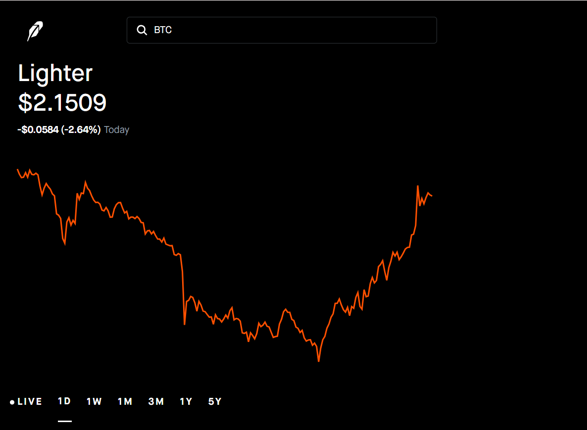 La chute de 15 % de Lighter a eu lieu suite au déploiement de la fonction de staking du réseau. Cependant, alors que le token était encore en baisse à deux chiffres, des informations ont révélé l’inscription prévue du token natif de Lighter, LIT, sur Robinhood, provoquant un redressement rapide de son cours.
