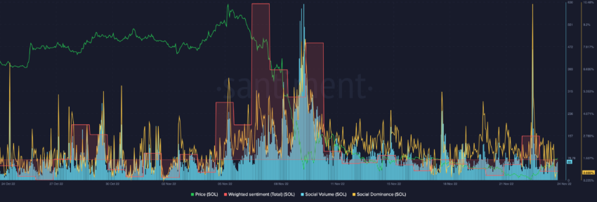 Cependant, les volumes sociaux de Solana ne présentent toujours pas d’activité majeure sur les réseaux sociaux en rapport avec l’actif. Le sentiment total pondéré pour SOL demeure négatif, tandis que la dominance sociale se trouve également affectée.