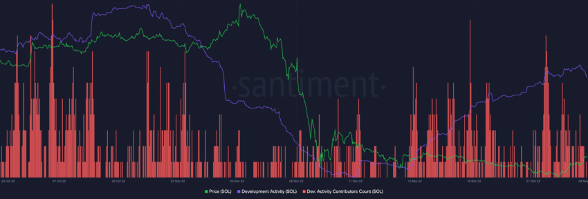 Malgré une structure globalement baissière du cours, SOL a encore connu une belle activité de développement. En effet, cette dernière s’est accrue tout au long du mois de novembre, tandis que les données sur les contributeurs au développement se sont maintenues à des niveaux supérieurs à la moyenne.