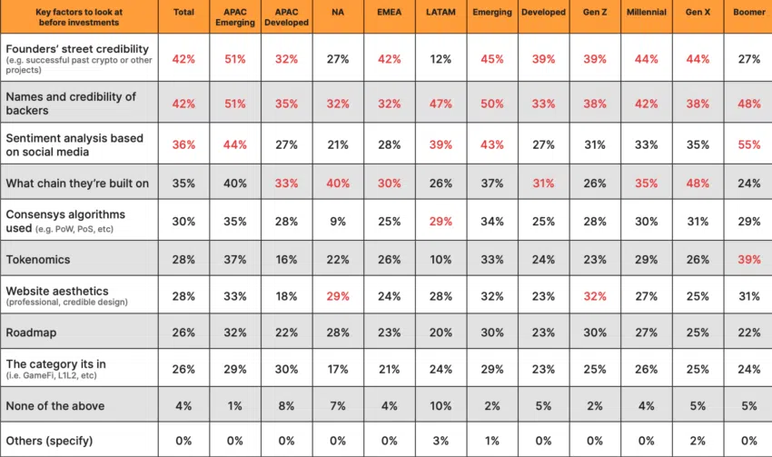 De même, beaucoup de participants ont pris leurs décisions d’investissement crypto en se basant sur des facteurs comme la réputation de l’équipe fondatrice, ainsi que les noms et la crédibilité de ceux qui soutiennent le projet. Pire encore, seulement 9 % à 35 % des participants se sont focalisés sur le mécanisme de consensus des projets dans lesquels ils ont investi.