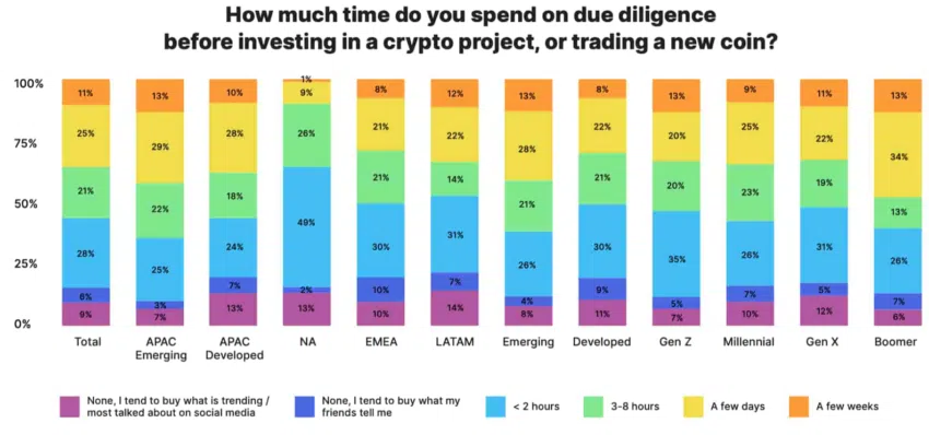 Comme le montre le graphique ci-dessous, la plupart des américains achètent la crypto sans faire suffisamment de recherches. En effet, 64% des nord-américains font moins de deux heures de recherche avant d’investir dans des projets crypto.