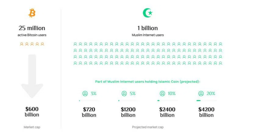 Avec une adoption de 3 %, Islamic Coin atteindrait une valeur de 720 milliards de dollars de capitalisation. Avec un taux d’adoption de 20 %, cette valeur monterait à 4,2 billions de dollars, soit quatre fois plus que l’actuelle capitalisation totale du marché crypto.