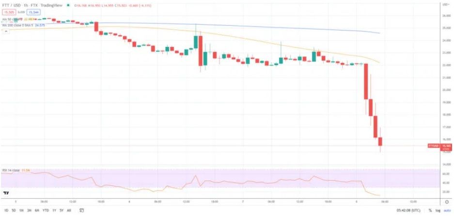 Au moment de la rédaction de cet article, le FTT avait chuté de 32 % en quatre heures seulement pour atteindre son point le plus bas à environ 15 $. Il a maintenant chuté de 81 % par rapport à son sommet historique de septembre 2021, situé au-dessus des 84 $.