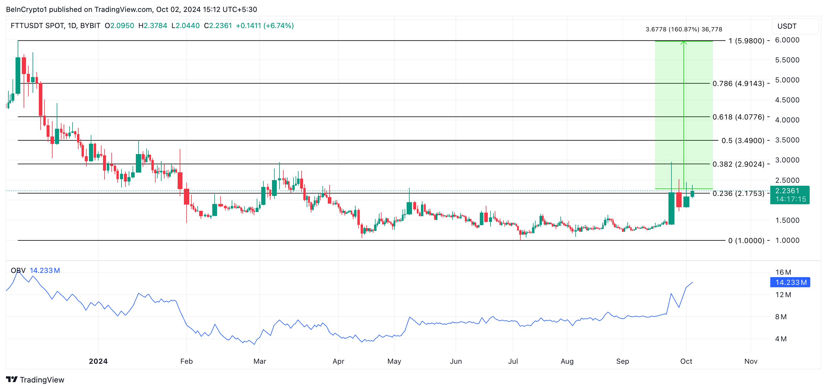 Le FTT se négocie actuellement à 2,23 $, enregistrant une hausse de son cours de 64 % au cours de la semaine écoulée. Cette hausse se trouve alimentée par l’enthousiasme croissant à l’approche de l’audience du 7 octobre, laquelle portera sur les plans de FTX pour rembourser ses créanciers et clients.