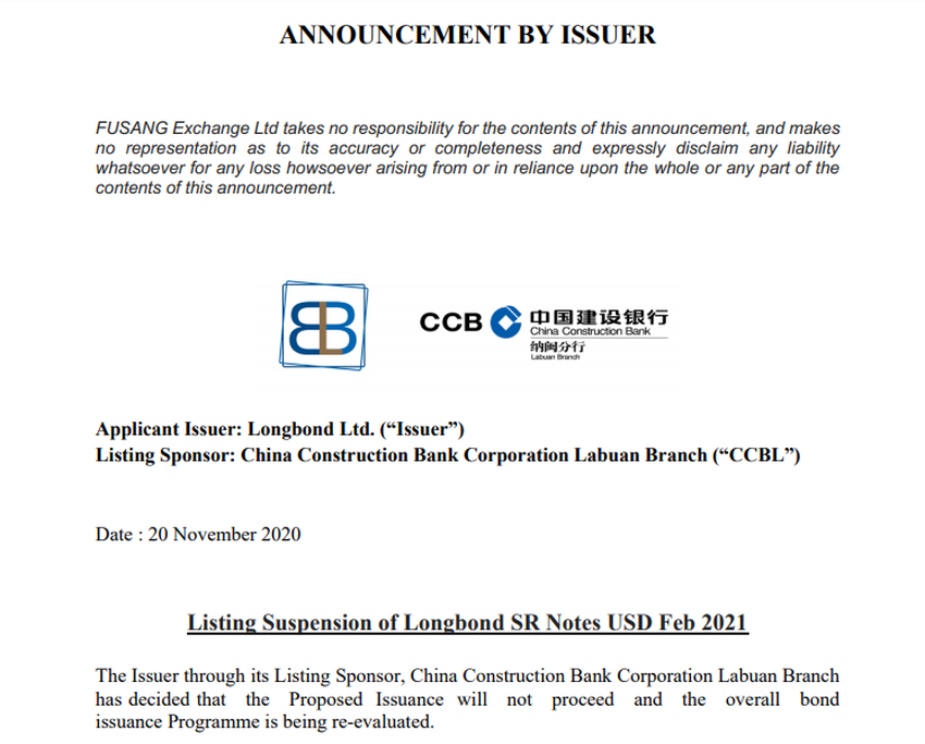 Dans une annonce sur son site Web, publiée le 23 novembre, FUSANG a révélé que l’obligation avait été suspendue après le retrait de la succursale de CCB à Labuan, en Malaisie.