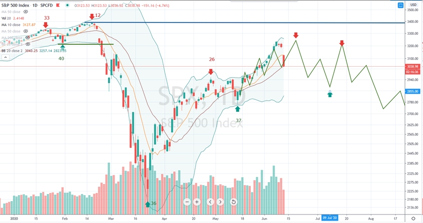 Le 11 juin, le cours du S&P 500 a baissé de 5,8%. C’est là son plus important déclin en pourcentage depuis le 16 mars, et il pourrait s’agir du début d’une tendance descendante de plus long terme.