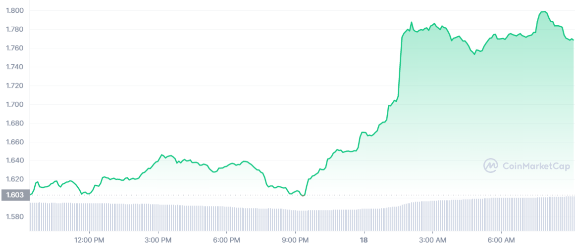 Le cours Arbitrum est en hausse de 10 % alors que le jeton s’échange à 1,77 $. Avec cette évolution récente, le jeton a depuis sereinement dépassé les 2 milliards de capitalisation boursière. Il devient même la 31ème cryptomonnaie de ce classement.