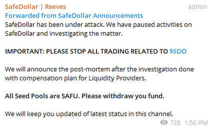 Le canal Telegram du protocole a émis un avertissement de l’attaque et a appelé les utilisateurs à cesser le commerce de SDO :