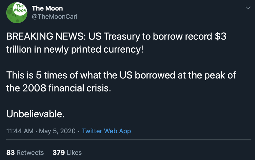 Dans un tweet récent, l’analyste The Moon (@TheMoonCarl) a également révélé qu’il s’agit de plus de 5 fois le montant qu’avaient emprunté les États-Unis au plus dur de la crise financière de 2008.