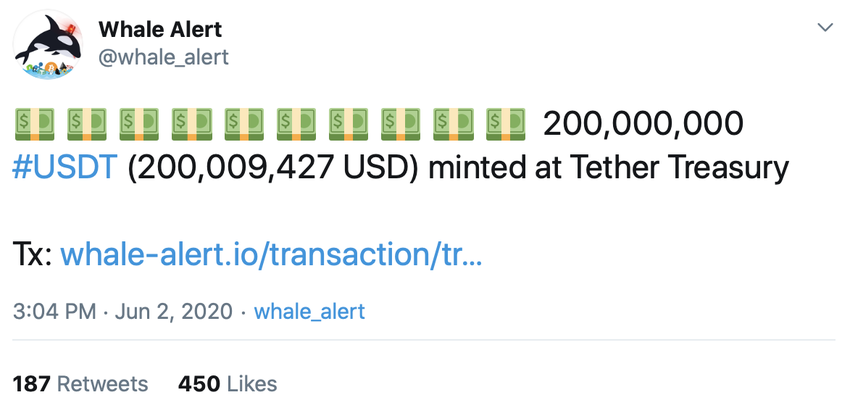 Comme BeInCrypto l’a précédemment rapporté, la trésorerie de Tether continue d’agir comme la Réserve fédérale américaine. Un rapport de Whale Alert (@whale_alert) plus tôt dans la journée a révélé que Tether venait d’émettre l’impressionnante somme de 200 millions d’USDT sur la blockchain de TRON.