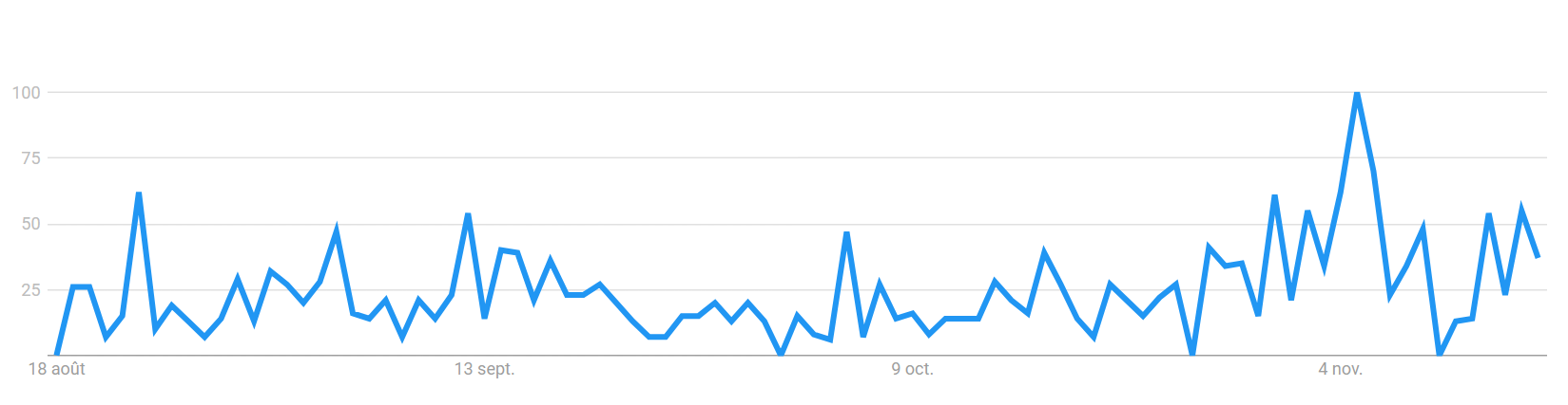 En nous intéressant sur la tendance globale des 90 derniers jours, nous constatons par ailleurs que son niveau d’intérêt a connu un pic en ce mois de novembre, même si la date de ce pic ne correspond pas à la date de son sommet historique.
