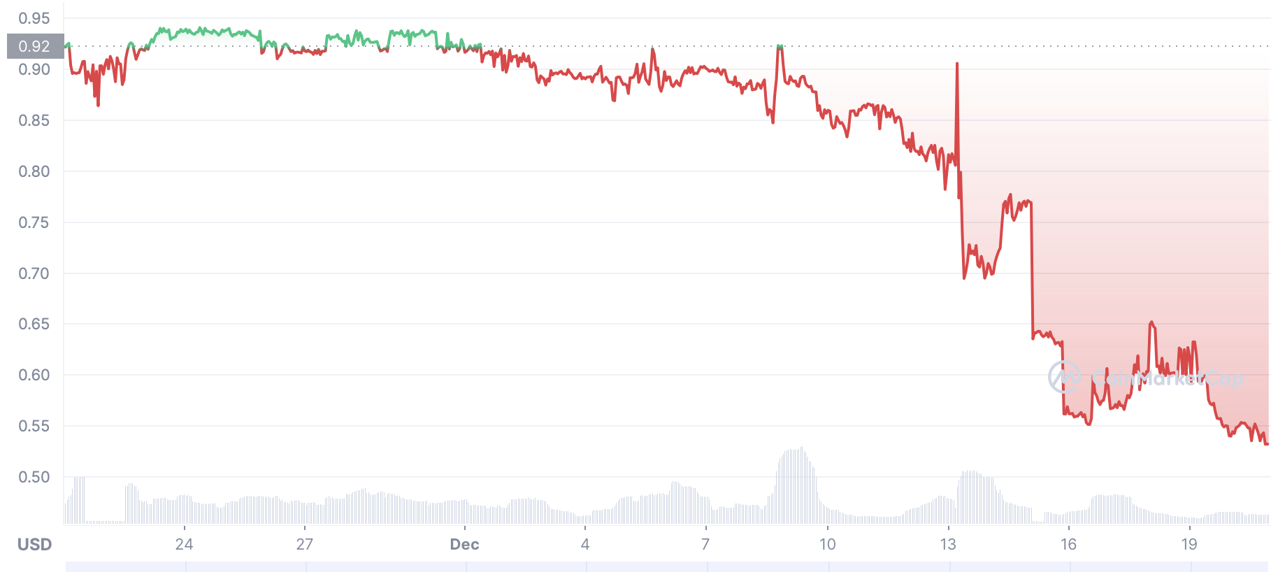 SponsoredD’après les données recueillies sûr CoinmarketCap, le cours du Neutrino USD a perdu 44,4 % sur les trente derniers jours. Actuellement, le stablecoin s’échange à 0,5173 $ alors qu’en principe, son prix devrait se rattacher au dollar.