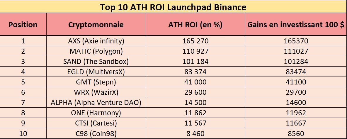 Pour compléter le top 5, on retrouve des projets également très connus de la crypto sphère : ⛱️ Sandbox, EGLD et 👟 GMT. Ils ont respectivement réalisé une hausse jusqu’à l’ATH de 101 184 %, 83 374 % et 41 000 %. Une belle illustration de la réussite évidente du Launchpad.