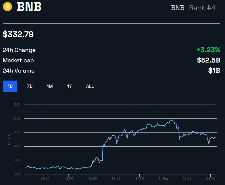 Étant donné que BNB est nécessaire pour le farming SUI, son cours a grimpé de 5 % au cours des 18 dernières heures. Après avoir atteint 339 $ aux premières heures de ce lundi, BNB se négocie actuellement à 333 $.